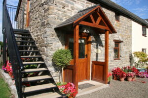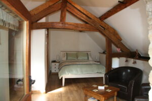 The Hayloft is a double en-suite with vaulted ceiling, exposed A frame and beams. There are lovely views over the garden and across open fields. The en-suite has a toilet, washbasin and a large luxury shower. A large room with plenty of space to sit and relax. Coffee and tea making facilities. There is direct access through a half glazed door and down a wrought iron staircase to the garden.
