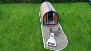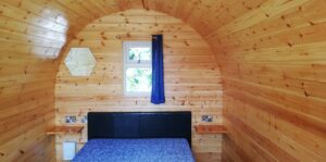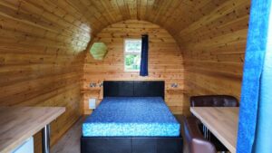 Larger Premier Glamping Pods have a 4ft 6 double bed, slimline fridge, breakfast bars and stools, heater, kettle, plates, crockery for 2 people inside. A bistro set and chimenea outside.