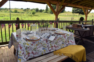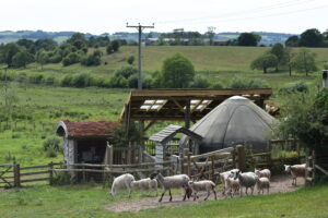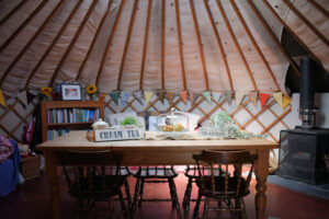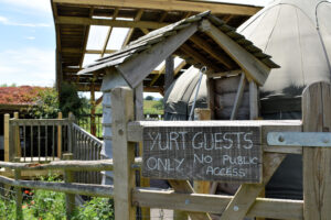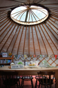 At Fordhall Organic Farm, we have a self-contained unit of Shropshire-made Mongolian Yurts.Sleeping up to 6 people, they are perfect for a romantic couple’s getaway, or a fun farm-themed family holiday. Sited in a secluded corner of the farm, guests can enjoy the peace and quiet of getting back to nature, with a delightful panoramic view from the decking, and no neighbours but the wildlife and livestock.The Yurts offer a perfect opportunity to escape the every day, as they are completely off-grid with no electricity, running water or wifi. Worry not if the off-grid lifestyle is unfamiliar though, the Yurts are fully equipped for a cosy and comfortable glamping experience – including a gas BBQ, hob and fridge, a camping shower and a compost loo. However, if guests would prefer a regular toilet and electric shower, these are available in the main building.Guests are left to their own devices during their stay, free to roam the farm trails which weave through the pasture, woodland and along the river. Glampers can also pre-order local and organic ingredients from the Farm Shop prior to their stay, to make their own meals with during their stay.